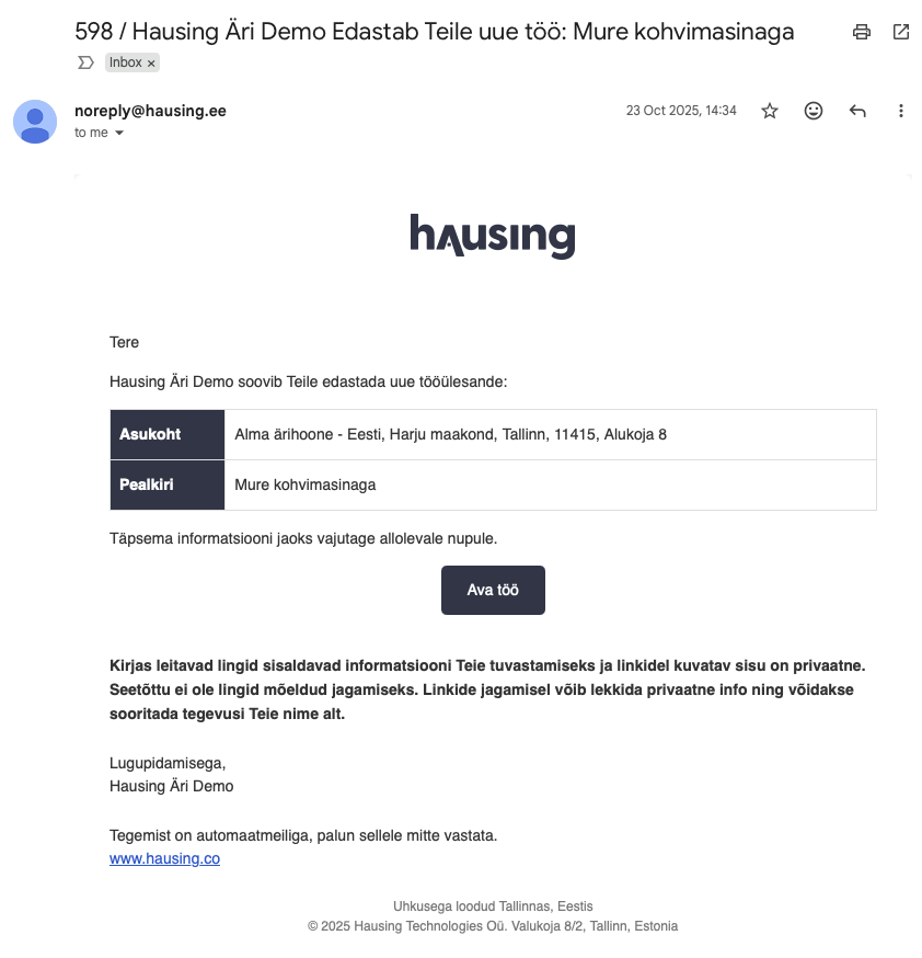 - Oma töölauale uuesti saamiseks võib alltöövõtja kasutada ükskõik millise töö linki, mis talle e-mailile tuli, sest kõik viivad samasse portaali.