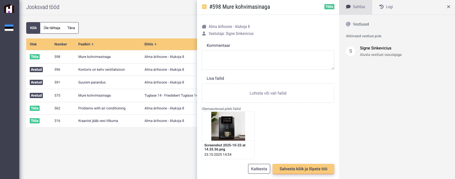 - Alltöövõtja saab tööle lisada kommentaare, pilte, faile ning alustada kliendipoolse vastutajaga suhtlust.