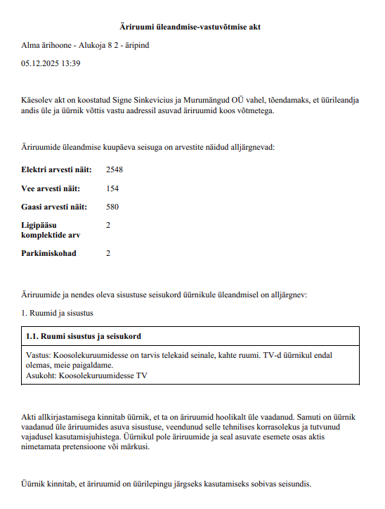 - Kui lõid akti, näed seda peale ülevaatuse lõpetamist ja saad selle alla laadida. Akti allkirjastamiseks vajuta "Allkirjasta akt" ning vali kas soovid sõrmega või digitaalselt allkirjastada. Tee igale kontaktisikule eraldi allkirjastamine, digitaalse valiku puhul vali kas soovid kohe Hausingus selle teha või saadad allkirjastamise kutsed e-mailile.