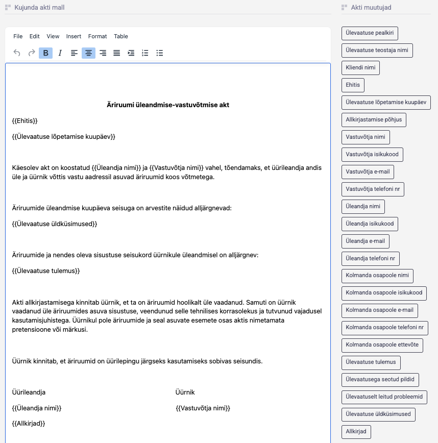 - Mallist paremal on akti muutujad ehk väljad millega saad dokumenti lisada ridasid mille süsteem täidab ise automaatselt. Muutija lisamiseks vajuta dokumendil sinna kohta kuhu muutuja peab minema ning seejärel vajuta muutujale. Vt näidet pildil akti mallist ja valmis aktist peale ülevaatuse lõpetamist: