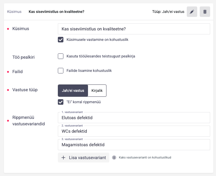 - Kategooria alla saad hakata lisama ülevaatuse küsimusi "+ lisa küsimus". Määra: