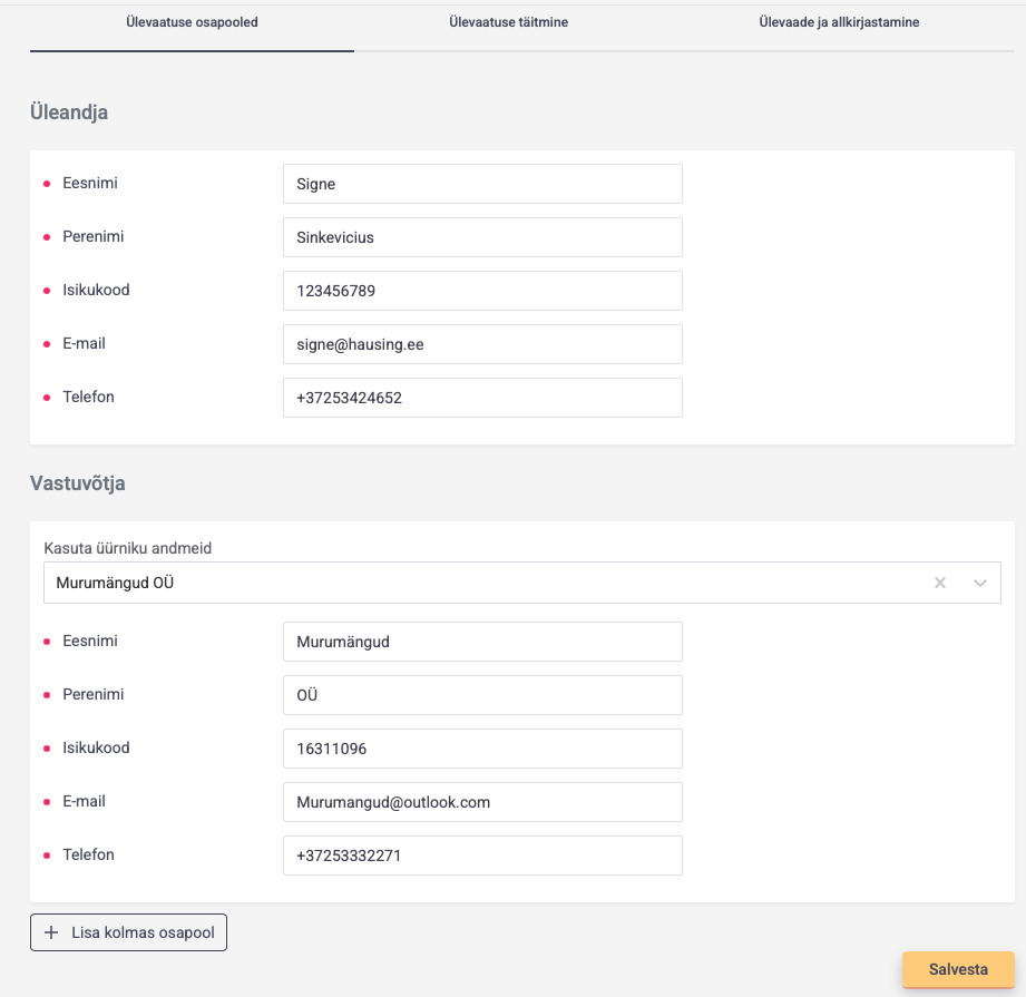 - Esmalt täida ära ülevaatuse osapoolte kontaktandmed. Vajadusel lisa ka kolmas osapool.