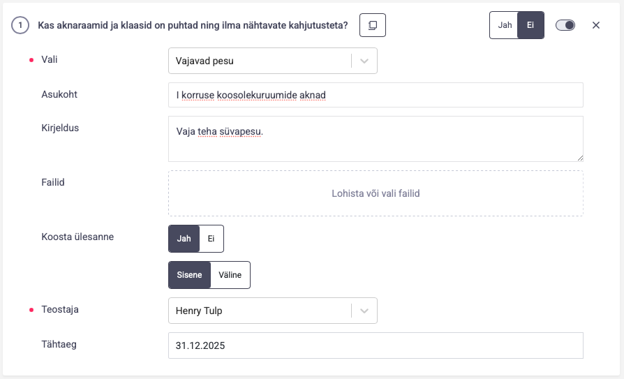 - Üldandmetesse saad lisada küsimused, millest ei pea tekkima peale ülevaatust töö. Nt pinna üleandmisel saad ära fikseerida arvestite näidud, antud võtmete arvu jne.