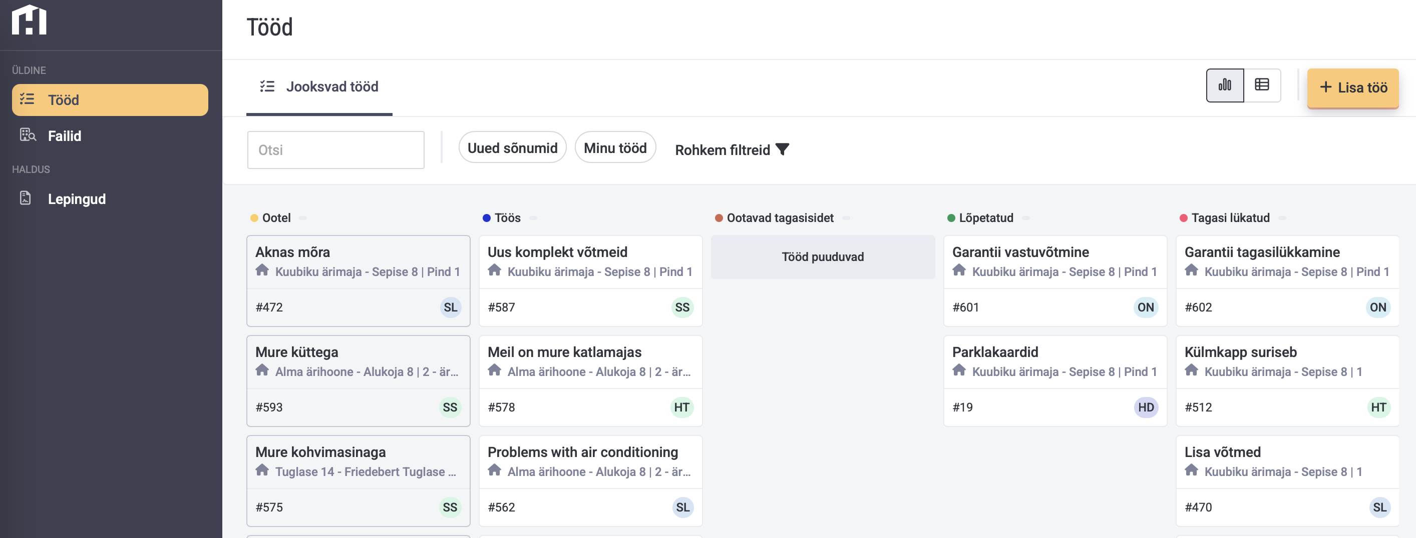 Vaadet saab erinevate filtritega filtreerida ja vaadata kas tahvel- või tabelvaates (nupp üleval paremal „Lisa töö“ kõrval.